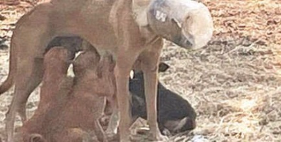 ഭരണിയിൽ തലകുടുങ്ങിയ തെരുവുനായ കുഞ്ഞുങ്ങൾക്ക് പാല് നൽകുന്നു.